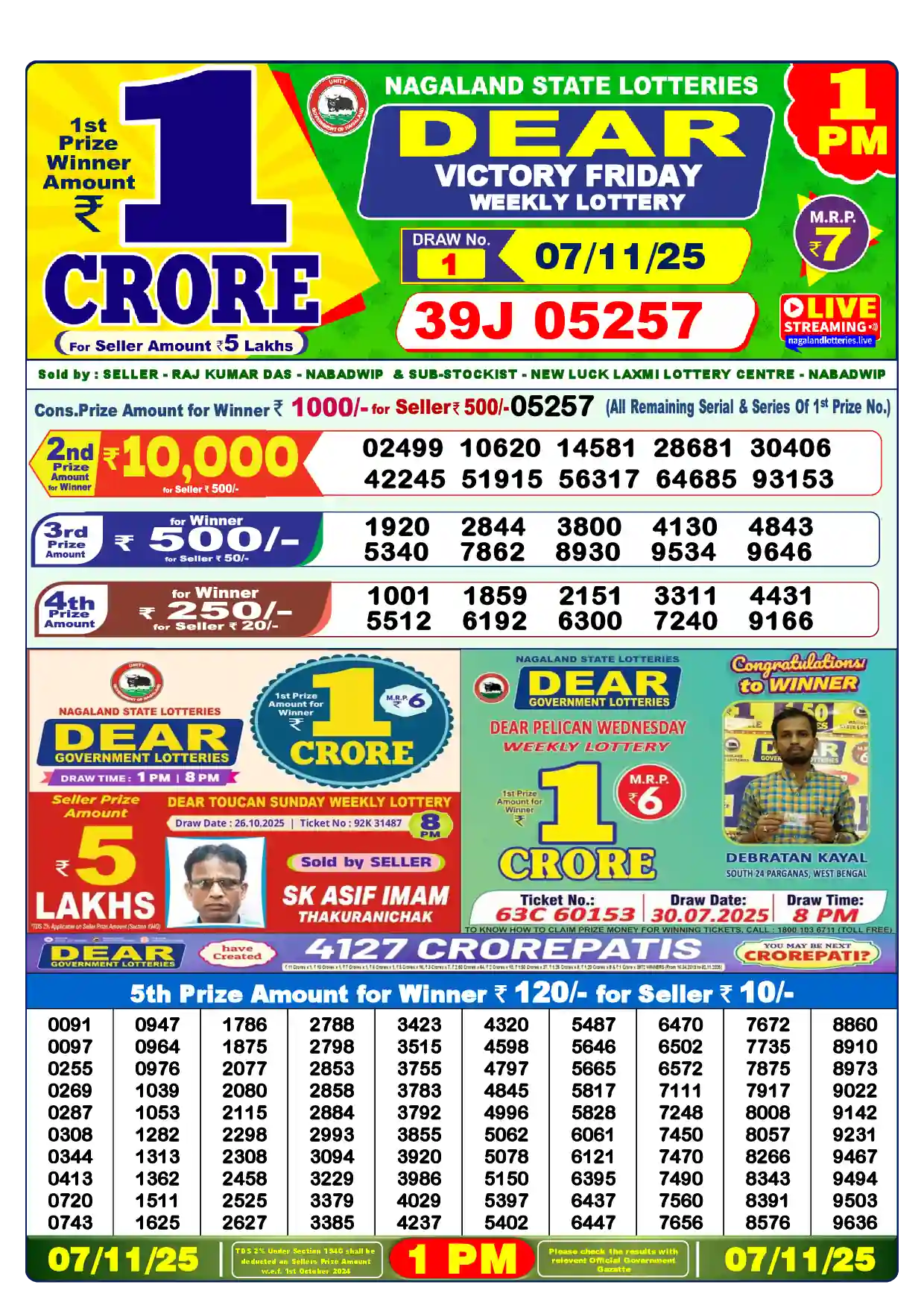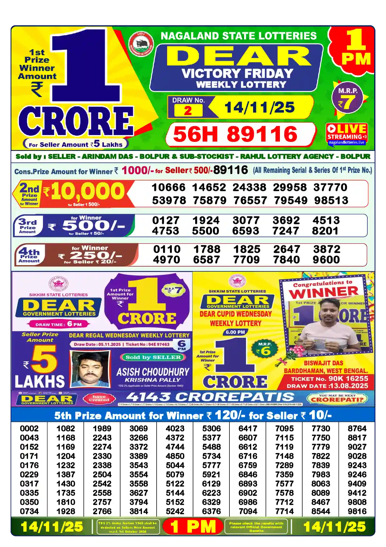 Lottery result 1PM morning Friday 14/11/2025 Check out all the Nagaland State Lottery results today.