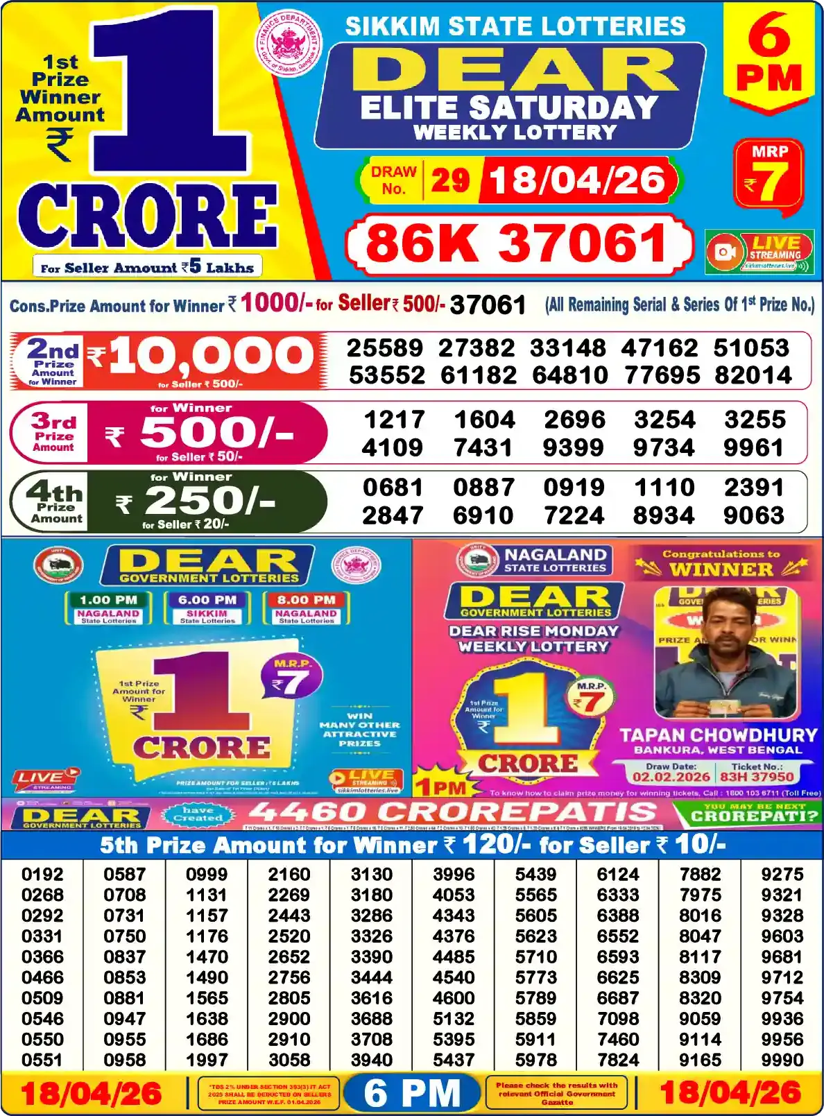 Lottery result 6PM evening Saturday 18/04/2026 Check out all the Nagaland State Lottery results today.